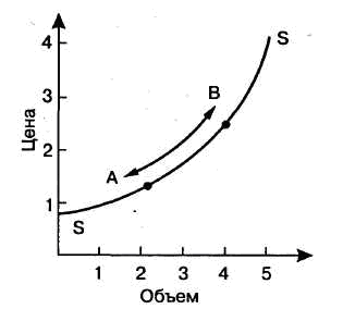 ДВИЖЕНИЕ ВДОЛЬ КРИВОЙ ПРЕДЛОЖЕНИЯ - реакция продавцов на изменение цены блага при прочих равных условиях; отражает изменение объема блага, которое производители желают и могут продать. Изменение объема предложения изображается движением вдоль кривой предложения (рис. 3.2).