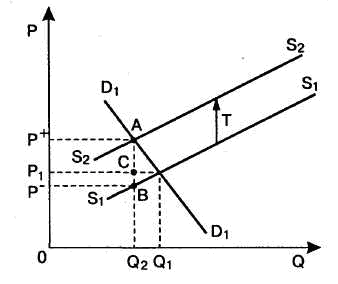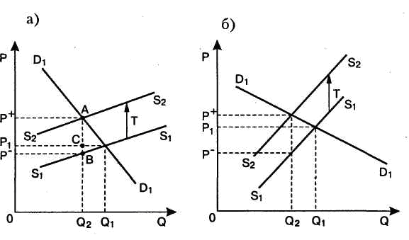 Начнем с первого варианта. Предположим, что введенный налог на каждую единицу блага составил Т руб. Допустим, что до введения налога линия спроса занимала положение D1DD1, a линия предложения - S1S1. Равновесная цена составляла Р1( равновесный объем продаж - Q1 (рис. 5.1). В результате введения налога произойдет сдвиг линии предложения вверх на величину Т, ибо для получения той же суммы выручки продавец будет согласен продать данное благо за цену, которая выше прежней на величину Т руб. Линия предложения займет положение S2S2. На рынке устанавливается новое равновесие, при котором объем продаж сократится с Q1 до Q2, цена для покупателей повысится с Р- до Р+. Общая сумма налога, поступающая в госбюджет, будет равна площади прямоугольника Р+АВР-. Налог, согласно условию этого варианта, уплачивают продавцы, но бремя налога распределяется между продавцами и покупателями. Взнос продавцов равен площади прямоугольника P1CBP-, а взнос покупателей - Р+ACP1.
