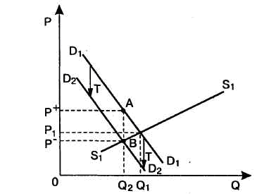 Рис. 5.1. Воздействие на рыночное равновесие акцизного налога при уплате его продавцами Второй вариант. Акцизный налог вносят в госбюджет покупатели. Покупатели будут согласны купить тот же объем блага, если его цена без налога будет на Т руб. ниже. В таком случае покупатели заплатят цену с включением налога, равную прежней цене. В результате линия спроса переместится вниз на Т (рис. 5.2). Новый объем продаж Q2, цены Р+ и Р- будут аналогичными варианту, когда налог вносят продавцы. Следовательно, не играет роли тот факт, кто выступает непосредственным плательщиком налога - продавцы или покупатели. Из рис. 5.2 мы видим, что и пропорции в распределении налогового бремени между продавцами и покупателями остаются теми же, что и при уплате налога продавцами.