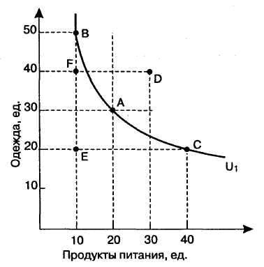 Кривая безразличия изображает совокупность наборов, между которыми потребитель не делает различий. Любой набор на кривой обеспечит один и тот же уровень удовлетворения. Иными словами, кривая безразличия изображает альтернативные наборы благ, которые доставляют одинаковый уровень полезности (рис. 8.1).