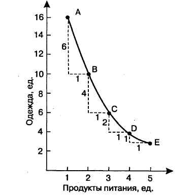 Рис. 8.2. Карта кривых безразличия Карта кривых безразличия дает представление о вкусах конкретного потребителя, поскольку иллюстрирует норму замещения двух благ при любых уровнях потребления данных благ. Когда речь идет о том, что известны вкусы потребителей, то имеется в виду вся карта кривых безразличия, а не текущее соотношение единиц двух благ. На карте кривых безразличия каждая кривая объединяет точки с одинаковой полезностью. Основным рабочим понятием ординалистской (порядковой) теории полезности считается предельная норма замещения MRS. Предельная норма замещения (MRS) показывает, от какого количества единиц одного блага потребитель должен отказаться, чтобы приобрести дополнительную единицу другого блага. Иными словами, это соотношение предельной полезности двух благ. Предельная норма замещения измеряет желание обменять одно благо на каждую единицу другого, при этом не приобретая и не теряя полезность. Предельная норма замещения представляет собой норму, в соответствии с которой одно благо может быть замещено другим без выигрыша или потери для удовлетворения потребителя. Значения предельной нормы замещения всегда отрицательны, так как увеличение количества приобретенных единиц одного блага предполагает уменьшение потребления другого, т. е. имеются разные знаки. Поскольку кривая безразличия выпукла вниз, к началу координат, то предельная норма замещения чаще всего уменьшается по мере увеличения потребления одного блага вместо другого. Это явление называют уменьшающейся предельной нормой замещения. Рис. 8.3 показывает, что, перемещаясь от набора потребительских товаров А к набору В, потребитель готов отказаться от шести единиц одежды, чтобы получить одну единицу продуктов питания. Двигаясь от набора В к набору С, он готов поступиться только четырьмя единицами одежды, чтобы получить дополнительную единицу продуктов питания, а при перемещении от С к D он откажется лишь от двух единиц одежды ради одной единицы продуктов питания. Чем больше одежды и меньше пищи потребляет человек, тем больше он готов отказаться от одежды ради продуктов питания.