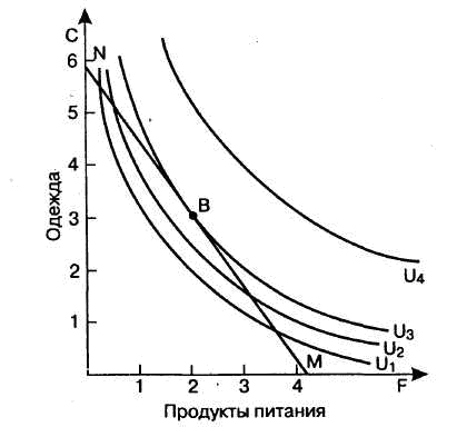 Чтобы описать предпочтения человека по всем наборам продуктов питания и одежды, можно изобразить семейство кривых безразличия, которое называется картой кривых безразличия. Карта кривых безразличия - способ графического изображения функции полезности для некоторого конкретного потребителя (рис. 8.2). На рис. 8.2 показаны четыре кривые безразличия, образующие собой семейство - карту кривых безразличия. Наборы на кривых безразличия, более удаленных от начала координат, доставляют потребителю большую полезность, а поэтому предпочтительнее, чем наборы на менее удаленных кривых. На рис. 8.2 U4>U3>U2>U1.