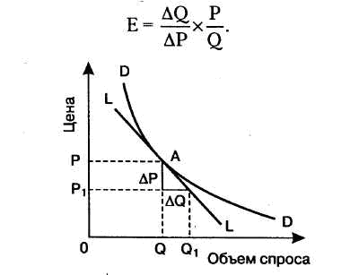Точечная эластичность - эластичность, измеренная в одной точке кривой спроса или предложения; является постоянной величиной повсюду, вдоль линии спроса и предложения. Точечная эластичность представляет собой точный показатель чувствительности спроса или предложения к изменениям цен, доходов и т. д. Точечная эластичность отражает реакцию спроса или предложения на бесконечно незначительное изменение цены, доходов и других факторов. Нередко возникает ситуация, когда необходимо знать эластичность на определенном участке кривой, соответствующем переходу от одного состояния к другому. В данном варианте обычно функция спроса или предложения не задана. Определение точечной эластичности иллюстрируется на рис. 18.1. Чтобы определить эластичность при цене Р, следует установить наклон кривой спроса в точке А, т. е. наклон касательной (LL) к кривой спроса в этой точке. Если прирост цены (ДР) незначителен, прирост объема (AQ), определяемый касательной LL, приближается к действительному. Из этого вытекает, что формула точечной эластичности представляется таким образом: