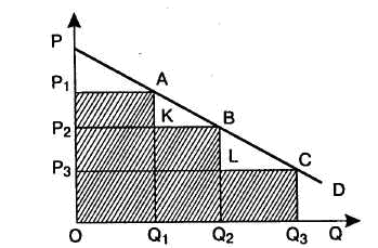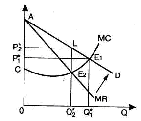 Рис. 29.1. Совершенная ценовая дискриминация Оптимальный выпуск монополии находится в точке L при пересечении кривых предельной выручки и предельных затрат (МС и MR) и составляет Q'2 при цене Р2. Излишек потребителей равен площади Р2* AL, излишек продавца равен площади CP2*LE2. Монополист присваивает себе весь потребительский излишек P*AL, который при совершенной конкуренции, при объеме производства Q2 был бы присвоен покупателем. Поскольку монополист не может иметь полной информации о функциях спроса всех возможных покупателей своего блага, этот вид ценовой дискриминации в чистом виде невозможен. Определенное приближение к чистой ценовой дискриминации возможно при незначительном количестве покупателей, когда каждая единица блага выпускается по заказам конкретных потребителей. Ценовая дискриминация второй степени имеет место, когда цены блага одинаковы для всех покупателей, однако различаются в зависимости от объема покупок. Следовательно, связь между общей выручкой монополиста (расходами покупателей) принимают нелинейный характер, а цены называются нелинейным, или многоставочным тарифом. При этом виде ценовой дискриминации блага группируются в определенные партии, на каждую из которой устанавливаются различные цены. На практике этот вид ценовой дискриминации проводится в форме скидок и надбавок на цены благ. Ценовую дискриминацию второй степени проиллюстрируем на рис. 29.2.