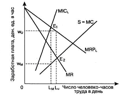 Двусторонняя монополия - ситуация, когда на рынке имеется только один продавец (как при монополии) и один покупатель (как при монопсонии). Под двусторонней монополией ронимается такая рыночная структура, при которой единственный продавец и единственный покупатель осуществляют куплю-продажу ресурсов производства (для продавца - это готовая продукция). При двусторонней монополии и покупатель, и продавец имеют возможности, вполне достаточные для контроля над ценами услуг ресурсов производства. Случай двусторонней монополии изображен на рис. 40.1. Линия S - кривая предложения рабочей силы, указывающая на цену этого ресурса, которую нужно уплатить с целью привлечения некоторого объема услуг данного ресурса. Поскольку фирма, покупающая ресурс, является монопсонией, она будет стремиться установить цену на уровне wM, необходимом для вовлечения объема услуг ресурса, соответствующего пересечению кривой MIC с кривой ее MRP фирмы. Такое пересечение совершается в точке E1, в которой фирма пожелает нанять LM единиц услуг этого ресурса и предложит цену в размере wM денежных единиц за час услуг ресурса, т. е. цену, необходимую, чтобы привлечь LM единиц услуг ресурса. Для максимизации прибыли монопольный продавец будет стараться установить такую цену, которая сыграет роль стимулятора в покупке объема услуг ресурса, соответствующего точке, где предельный доход от продажи услуг от реализуемого ресурса равен предельным издержкам на него. В этом случае цена, максимизирующая прибыль, будет соответствовать точке Е2, где MR = МС. В этой точке монополия захочет реализовать Lu единиц услуг ресурса. Чтобы вынудить нанимателя лимитировать покупку услуг ресурса данным объемом, монопольный продавец будет стремиться определить цену, равную wu.