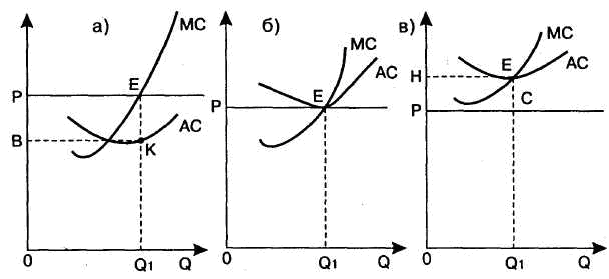 Рис. 44.1. Земельная, рента Если рента превышает равновесную цену, то объем спроса на землю со стороны фирм будет меньше существующего объема предложения земли. Некоторые собственники земли не смогут сдать в аренду свою землю, что вынудит их пойти на более низкую ренту. Если рента будет ниже своей равновесной величины, то увеличившийся спрос на землю со стороны фирм приведет к возвращению факторной цены в равновесное состояние. Следовательно, только при конкурентной цене, когда общий объем спроса на землю равен ее фиксированному предложению, рынок будет находиться в равновесном состоянии. Ценность земли выводится всецело из ценности продукта, а не наоборот. Рента выступает в двух основных формах: а) чистая экономическая рента как доход, приносимый производственным ресурсом только в силу его ограниченности, и б) дифференциальная рента как доход, приносимый производственным ресурсом в зависимости от его качества. Понятие ренты применимо не только к земле, но и к любому фактору, предложение которого фиксировано. Земельные участки отличаются друг от друга своей продуктивностью, которая предопределяется их местоположением, климатическими особенностями, сферой использования и т. д. Это является объективной основой для образования дифференциальной ренты. Рассмотрим ее на примере естественного плодородия. Предположим, что три участка земли отличаются своим качеством: лучший, средний и худший по плодородию. Допустим, что участки равны по площади и по вложению труда и капитала, тем не менее, поскольку они различаются по плодородию, предельные и средние издержки на единицу продукции будут также различаться (рис. 44.2). На лучшем участке (а) будет получена дифференциальная рента ВРЕК; на среднем участке (б) производственные издержки будут лишь компенсированы, не извлекая дохода; на худшем участке (в) образуется убыток.