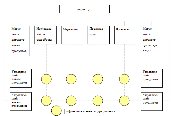 Считается, что одной из важнейших задач подготовительного этапа является выбор наиболее эффективных организационных форм, в рамках которых будет осуществляться разработка новых продуктов. Процесс создания новых продуктов затрагивает все сферы деятельности предприятия. В нем так или иначе участвует большинство функциональных подразделений, включая отделы сбыта, снабжения, маркетинга, научных исследований, а также производственный, финансовый и юридический отделы. Наилучшие результаты достигаются в тех случаях, когда усилия всех служб, связанных с разработкой нового продукта, координируются из одного центра. Этому обычно противодействует стремление отдельных подразделений не только не подчиняться какой-либо координации, но и самим осуществлять контроль над разработкой нового продукта. Серьезные проблемы возникают в тех случаях, когда система управления предприятием построена по функциональному принципу. Эта структура управления создавалась для того, чтобы постоянно контролировать осуществление ряда функций, имеющих целью получение определенного дохода каждый день, каждую неделю, каждый месяц. Так, отдел маркетинга стремится выполнить текущие цели, связанные с продажей товаров, производственный отдел озабочен выполнением графиков изготовления продукции, финансовый - следит за своевременным обеспечением ресурсами процессов производства и сбыта продуктов. При таком подходе все усилия направлены на то, чтобы получить определенный размер годовой прибыли. Хотя функциональные службы знают при этом, что подготовка будущего - очень важное дело, но, занятые текущими проблемами, они практически ничего не делают в этом направлении. В отличие от повседневной деятельности разработка новых продуктов определяет прибыльность предприятия в будущем. Эта процедура не всегда пользуется популярностью у работников, занятых оперативной деятельностью, так как она требует затрат сейчас, а отдачу дает только в будущем. По существу, на предприятии имеет место конкуренция за людские, материальные, финансовые и другие ресурсы, между теми, кто занят текущей деятельностью, и теми, кто разрабатывает новые продукты. Поэтому организация, занимающаяся разработкой новых продуктов, как бы накладывается на организацию, занятую текущей деятельностью. Перед высшим руководством всегда стоят проблемы, связанные с этой конкуренцией и необходимостью согласования краткосрочных и долгосрочных целей компании. Как показала практика американских компаний, наилучшим образом указанные проблемы решаются с помощью не функциональной, а матричной структуры управления, показанной на рис.2. Согласно этой схеме, специалисты и руководители, занятые разработкой новых продуктов, находятся в постоянном контакте с соответствующими специалистами функциональных отделов.