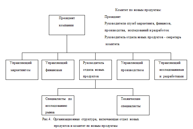 Обычно этот комитет функционирует под эгидой президента, который одновременно является его председателем. Членами комитета являются руководители функциональных служб, секретарем - руководитель отдела новых продуктов, который организует и планирует заседания (рис.4). Комитет по новым продуктам формирует политику в отношении разработки новых продуктов, устанавливает приоритеты, контролирует ход выполнения работ, принимает решения о переходе к полномасштабной коммерческой реализации.