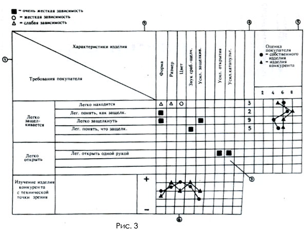 Определение характеристики изделияХарактеристики изделия следует документировать точно так же, как и требования покупателя в виде дерева. Чтобы его построить, можно применить тот же самый метод групповых упражнений. Характеристики изделия должны быть измеримы, как правило, в физических единицах. Некоторые характеристики, такие, как эргономические или эстетические, приходится оценивать по вопросам репрезентативных групп покупателей, представляющих определенный сегмент рынка. Характеристики изделия надо рассматривать с позиции покупателя и, следовательно, они не должны включать критерии внутреннего проекта, технические решения или подобные им аспекты. Характеристики изделия записываются в верхней части матрицы, обозначенной цифрой 2). Установление взаимосвязей между желаниями покупателя и характеристиками изделияТеперь следует установить связи между пожеланиями покупателя и характеристиками изделия. Этот процесс обычно выполняется в ходе коллективного обсуждения силы этой связи. Связи обозначаются значками, которые отражают их силу. Если никакой связи нет, клетка остается пустой. В нашем примере в части, обозначенной цифрой 3, мы видим очень жесткую связь между формой замка и требованием простоты защелкивания. Усилие защелкивания тоже должно быть связано с простотой защелкивания. Проведение обследований покупателей, изделий и конкурентовСобрав в одном документе все требования покупателей и характеристики изделия, а также установив связи между "ими легко понять, какая информация уже есть, а какую нужно еще собирать путем разного рода обследований. Эти обследования могут дополнить матрицу столбцом, в котором приведены оценки весов требований, полученные в результате дискуссий покупателей и данными о степени удовлетворенности покупателей нашим продуктом и изделиями конкурентов. Веса потребительских требовании собраны в столбце, обозначенном цифрой 4. Степень удовлетворенности каждого требования для различных изделий зафиксирована в части матрицы, обозначенной цифрой 5. Профилограммы делают информацию более наглядной, чем цифры. Также проводится обследование изделия конкурента с точки зрения технических различий, чтобы выявить различия в оценках покупателей. Результаты такого изучения изделий конкурентов сведены в части матрицы, обозначенной цифрой 6. Формулировка характеристик изделия и их целевых значенийПроцесс формулировки целевых значений для каждой характеристики изделия довольно сложен. Чтобы подобрать подходящие цели стоит обратить внимание на следующие факты: