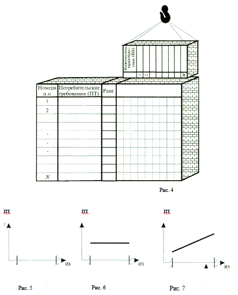 Таким образом, у нас есть список потребительских требований (ПТ), составленный на языке потребителя, и инженерные характеристики, сформулированные на профессиональном жаргоне. Для успешной разработки изделия нужно сделать что-то вроде словаря перевода ПТ в ИХ. Для этого применяется простой прием: строится таблица - матрица. Мы продолжаем верхнюю и боковую таблицы до пересечения их друг с другом. Получаются клетки еще одной таблицы Сколько клеток будет в этой таблице узнать просто - число строк, умноженное на число столбцов (рис. 4). Что мы хотим сделать с этой таблицей? Естественно, заполнить ее клетки. Ответом на какие вопросы мы хотим ее заполнить? У нас есть ИХ, я их откладываю по горизонтальной оси, а по вертикальной - ПТ (рис. 5). Когда я говорю об ИХ, я должен учитывать, что они заданы на некотором ограниченном интервале оси. Выбор значений ИХ внутри области, в которой она может существовать, - элемент нашей работы. В результате опытно-конструкторских и научно-исследовательских работ мы должны сказать, в какой точке этого интервала нам надо удержать ИХ, чтобы продукция была хорошей, т.е. такой, какую купит потребитель. А это значит, что мы должны ответить на вопрос: как зависит данное ПТ от того, какое значение мы придадим данной ИХ? Если представить себе, что ПТ не зависит от ИХ (рис. 6), это будет значить, что потребителю совершенно безразлично, какое значение ИХ выбрано. Представим себе другой вариант (рис. 7). В этом случае, чем ближе мы будем держаться к правому краю области возможных значений для ИХ, тем лучше удовлетворим нашего любимого потребителя. Наконец, может быть такая картинка, с экстремумом (рис. 8) Вот это действительно то, о чем мечтает потребитель. Потребитель не умеет думать в этих терминах, просто это значение ему нравится больше, чем другое. Каким способом мы можем узнать, какой вид у этой зависимости в каждой из огромного числа (тысяч) клеток?