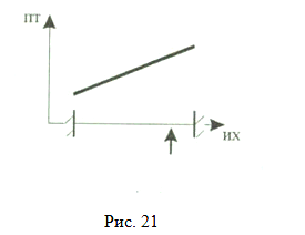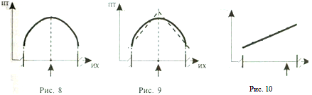 Во всех случаях для нас важно получить представление о xapaктере зависимости между ИХ и ПТ, о силе этой зависимости, "жесткости" связи. По характеру зависимости бывают линейные, нелинейные и сложные. А для измерения силы связи обычно используется статистическая оценка коэффициента корреляции. В СФК обычно рассматриваются только линейные зависимости, так как они вполне подходят в качестве первого приближения А на более сложные случаи приходится просто закрывать глаза. К этом этапе работы для них нет ни времени, ни денег. А вот для оценки (очень грубой) коэффициентов корреляции линейных зависимостей есть все, что нужно. Эти оценки играют СФК ключевую роль. В редких случаях строгих функциональных зависимостей этот коэффициент будет близок к единице, знак которой определяется направлением связи. Единица - это жесткая детерминированная связь. А когда мы ничего не видим, эта xapaктеристика оказывается равной нулю. Для корреляционной связи это число будет равным +0,5 (это может быть любое число, лежащее между 1 и 0) и, чем ближе к 1, тем теснее точки группируются вокруг линии. В случае параболы появляются трудности, так как коэффициент корреляции не годится для нелинейных зависимостей, и приходится разбивать эту картинку на две, считать, что обеих сторон прямые, и для каждой из этих прямых говорить корреляционной связи (рис. 9). Когда мы встречаемся с такого рода зависимостями, мы говори не о функциональной связи, а о корреляционной. Если изменение какой-то ИХ совершенно точно меняет предпочтение потребителя, то мы будем иметь зависимость, приведенную на рис. 10.