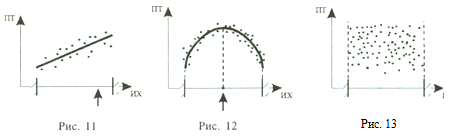 Вид зависимости не имеет значения. Когда же мы будем иметь Дело с не так ярко выраженными, нефункциональными зависимостями, тогда в результате измерений, мы будем получать точки, которые будут рассеиваться относительно этой прямой. Если разброс имеет вытянутый характер, то это говорит о том, что между рассматриваемыми переменными возможна некоторая зависимость (рис. 11). Но она тем сильнее выражена, чем теснее эти точки лежат относительно какой-то линии. В предельном случае, они все лягут на прямую, и мы будем иметь яркую закономерность (см. рис. 10). Когда картинка такая, как на рис. 11, связь - корреляционная. Следующий случай неприятный: криволинейная зависимость, разброс относительно параболы (рис. 12). А на рис. 13 - хаотический разброс точек в плоскости, мы зависимости не видим. Но утверждать, что ее нет, мы не можем.