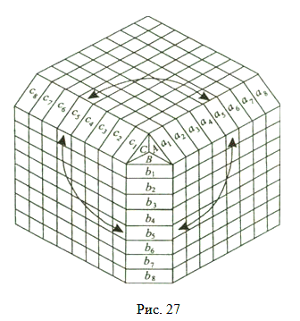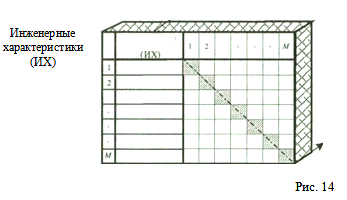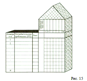 Вот в первой главной таблице, где есть потребительские требования, только инженерными службами нельзя обойтись, потому что здесь требуется привлечение других специалистов. А корреляции между инженерными характеристиками - это внутреннее дело нашего "мозгового центра", нашего отдела исследований и разработок, нашей центральной заводской лаборатории, исследовательского института, который мы привлекли к выполнению этой работы. При рассмотрении этой турнирной таблицы обратите внимание на такой очевидный факт: если мы знаем треугольную часть (верхнюю или нижнюю), то мы знаем все. Информация в этой таблице повторяется два раза, ибо, если вот это свойство коррелировано с тем, то верно и обратное, если они не коррелированы, то опять верно. Штрих-пунктирная линия с двумя стрелками на рис. 14 показывает, как выделяется верхняя треугольная часть таблицы. После заполнения этой таблицы принятыми условными знаками возьмем ее треугольную половину и "пристроим", как показано на рис. 15. Становится ясно, что мы постепенно складываем из блоков "дом". А строительство дома - дело серьезное. Значит, когда мы создаем или проектируем что-то, мы пользуемся набором инженерных характеристик для того, чтобы выбрать конструкцию, технологию, обеспечить нужные свойства продукции. Эти характеристики определяют, каким способом, при каких условиях, в каких режимах мы будем вести процесс производства, чтобы, в конечном счете, получить продукцию, в максимальной степени отвечающую потребительским требованиям.