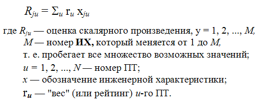 Теперь, мы берем столбец, где записаны веса потребительских требований, т. е. степень важности каждого из потребительских требований на данном рынке. Представьте себе, что у меня есть инженерная характеристика, которая с коэффициентом корреляции +1 влияет на данное потребительское требование. Но данное потребительское требование имеет вес 0. Хотя очень хорошо, что оно влияет сильно на эту характеристику, но сама по себе данная характеристика стоит в конце рейтинговой таблицы, и поэтому серьезной роли установленная зависимость на рынке не сыграет. Полученные числа будут иметь знак, причем в этом столбце может быть больше чисел с плюсом или больше с минусом. Наша задача теперь - изобразить то, что мы реально посчитаем для каждого столбца. Значит, вектор весов у нас постоянный для всех столбцов. Величина скалярного произведения вычисляется по формуле: