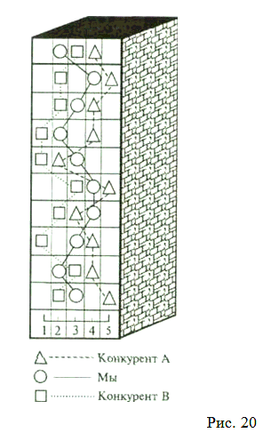 И, поскольку мы занимаемся разработкой новой продукции, а тем временем производим какую-то старую, мы можем на этой картинке изобразить и себя. Не с точки зрения того, что мы хотим сделать в будущем, а с точки зрения того, что есть сейчас. Из анализа предпочтения потребителя по каждому потребительскому требованию складывается картина, которая называется профилем организации. Если в каждой строчке построить такую шкалу и на эту шкалу нанести три значка (треугольничек для конкурента А, квадратик для конкурента В и кружочек для нас), то можно соединить все треугольнички и получить профиль конкурента А (см. рис. 20). Если соединить все квадратики, то получим профиль конкурента В. А если соединить все кружочки, получим свой исходный профиль. Операция эта довольно серьезная и мудреная, она называется английским словом бенчмаркинг [16-18]. Для нас конкурент А и конкурент В - это своеобразные эталоны, и мы себя сравниваем с ними. Вообще же бенчмаркинг имеет очень большое значение, и это - самостоятельная наука внутри науки о качестве. Впервые эта процедура была предложена в 1982 г. Она, заслуживает отдельного подробного рассмотрения. Пока для наших целей достаточно сказать, что сравнение этих трех кривых показывает исходную ситуацию. По каким потребительским требованиям наши позиции прочны и хороши? Может быть, не стоит сейчас вкладывать много времени и денег в их удовлетворение. А по каким потребительским требованиям мы имеем "кол с минусом", и надо немедленно что-то делать, чтобы улучшать ситуацию? Эта информация нужна снова для того, чтобы принять главное решение о том, что надо делать. Кроме того, информация о динамике профиля фирмы во времени - это информация исключительной важности, показывающая, как фирма развивается. Сравнивая профиль конкурента А в этом году, в следующем и еще через год, мы можем ответить на множество вопросов относительно решений, принимаемых руководством данной фирмы в каждый конкретный момент.