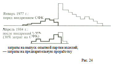 Описанный выше процесс называется параллельной инженерной разработкой (ПИР). Он радикально меняет не только технологию работы фирмы, но и ее культуру. Ясно, что это долгое, дорогое и кропотливое дело. Стоит ли игра свеч? В одной из лучших работ о структурировании функции качества (СФК) [21] приводятся яркие аргументы в пользу перехода на рельсы СФК для всех организаций, действующих на рынке. Их аргументы построены на данных пионера в области СФК - японской фирмы Топота. На рис. 24 приводятся сравнительные данные по затратам этой фирмы на предварительную проработку и выпуск опытной партии автомобилей. Категории затрат, представленные гистограммами, не расшифрованы. Общая экономия затрат превышает 60%. Да еще и время сокращается более, чем вдвое.
