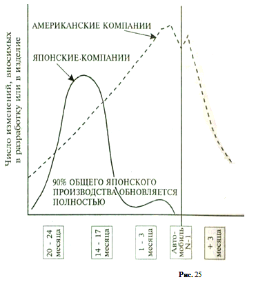 На рис. 25 из той же работы приводится любопытное сравнение интенсивности разработки легкового автомобиля в Японии и в США. По горизонтальной оси отложено время. Причем оно откладывается в двух противоположных направлениях от момента схода с конвейера первого промышленного изделия. Слева время движется назад, а справа - вперед. По вертикальной оси отложен показатель, характеризующий интенсивность разработки - число изменений, вносимых в конструкцию или в изделие в единицу времени. Два графика - сплошной и пунктирный - относятся соответственно к японским и американским компаниям. Они усреднены по десяти ведущим автомобильным компаниям каждой страны. Здесь, как говорится, комментарии излишни.