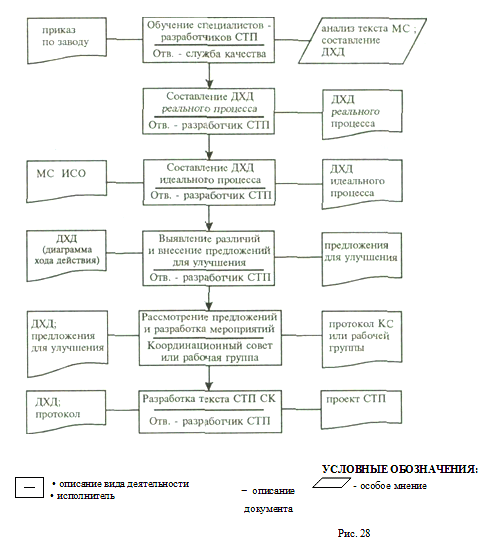 Анализ матричных данных. Обычно считается, что при решении задач большой сложности, для которых и разработаны 7-Р методы, надо последовательно применять их все. И только для анализа матричных данных сделано некоторое "послабление". Этот анализ часто рассматривается как факультативный. Связано это с проблемами, которые возникают при систематическом полномасштабном применении всего арсенала методов многомерного статистического анализа [34], которые требуются в таких случаях. В сущности, это проблема взаимодействия организаций, работающих на рынке, со статистиками-консультантами. Видно, что проблема глобальная, а ее решение весьма актуально. Конечно, из тщательно собранных, хорошо структурированных и наглядно представленных данных можно извлечь некоторую очень полезную информацию и "голыми руками", о чем свидетельствует элемент нашего "дома", представленный на рис. 18. Там нам удалось выделить наиболее важные для разработки инженерные характеристики. И это пример обработки матричных данных. Тем не менее, потенциал мощных современных методов многомерного статистического анализа явно недоиспользуется, а значит, теряется некоторая информация, уже собранная и, быть может, решающая для достижения успеха. Блок-схема процесса принятия решений (ППР). Как бы там ни было, но рано или поздно мы приходим к выводу, что сбор и анализ информации завершены, и пора переходить к выработке алгоритма реализации намеченного решения поставленной перед нами задачи. Это может быть, например, задача построения "дома качества". Особенность ситуации заключается в том, что в момент разработки алгоритма мы еще не располагаем всей полнотой необходимой информации. Из-за этого появляется некоторая неопределенность, приводящая к ветвлению плана действий. Кроме того, соображения безопасности толкают нас к рассмотрению возможных неблагоприятных вариантов развития событий в духе анализа деревьев отказов и анализа характера и последствий отказов (АХПО) [35]. Для описания таких алгоритмов разработано множество вариантов блок-схем. В объеме этой работы трудно привести конкретный пример такой блок-схемы применительно к СФК. Поэтому ограничимся примером из недавней работы [36], где обсуждается родственная нам тема о разработке документов системы качества (рис. 28).
