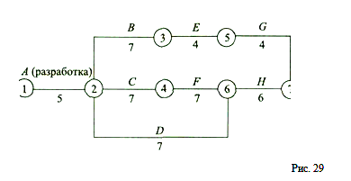Ясно, что блок-схемы - это инструмент, который помогает запустить механизм непрерывного планирования. Но теперь пора приступить к самому процессу планирования. Для этого и существует следующий, последний метод. Стрелочная диаграмма. Если предыдущий метод, как утверждают разработчики 7-Р методов, был создан д-ром Дзиро Кондо и затем вошел в число методов исследования операций, то стрелочная диаграмма - это псевдоним хорошо известного метода сетевого планирования. Кроме этого известного метода, в тех же целях используются еще и так называемые диаграммы Гантта. На рис. 29 вместе диаграмма Гантта и сетевой график для гипотетического примера, заимствованные из работы [32]. Построение таких моделей завершает логический цикл превращения первоначальной сырой идеи в конкретный практический план, готовый к реализации.