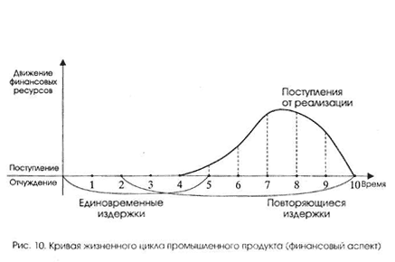 Первая фаза выхода продукта на рынок характеризуется тем, что продукт новый, для него создается рынок. На это требуются большие затраты. Необходимо прилагать усилия для того, чтобы продукт был воспринят на рынке и чтобы была достигнута точка безубыточности (break-even point), определяющая необходимый минимальный объем производства продукта. На второй фазе жизненного цикла продукта происходит быстрое расширение продукта на рынке. Покупатель принимает продукт, расширяются продажи, и для фирмы появляется возможность получения прибыли. Так как на второй фазе спрос на продукт резко растет, то, казалось бы, у фирмы не должно возникать проблем: делай прибыль, окупай произведенные ранее затраты. Однако на этой фазе возникают свои трудности, которые связаны с тем, что конкуренты тоже предлагают аналогичный продукт. Поэтому текущие задачи фирмы на второй фазе в значительной мере сфокусированы на привлечении интереса покупателей не просто к данному продукту, а к продукту своей марки. На второй фазе идет конкурентная борьба за захват покупателей, борьба за долю фирмы на рынке. Третья фаза жизненного цикла продукта, называемая фазой зрелости продукта, охватывает тот этап в жизни продукта, которому соответствуют насыщение рынка данным продуктом и стабилизация или даже снижение прибыли от реализации продукта. Для данной фазы характерны усиление ценовой конкуренции, медленное снижение цен, приводящее к постепенному снижению прибыльности продукта в конце фазы. Четвертая фаза жизненного цикла продукта состоит в том, что продукт уходит с рынка. Спрос на продукт падает. Это приводит к значительному падению его прибыльности. Фирма сосредоточена на том, как наиболее выгодно или же с наименьшими потерями снять продукт с производства и увести с рынка. При решении данной задачи фирма постоянно должна концентрировать внимание на двух факторах: времени и снижающейся прибыльности. На рис. 10 показана типичная кривая жизненного цикла промышленного продукта, отражающая зависимость между фазами жизненного цикла продукта, издержками на его создание и производство и доходами от реализации продукта. В данную схему включен также этап разработки продукта, который можно считать нулевой фазой жизненного цикла. Как наглядно показано на рис., сначала фирма осуществляет только затраты, затем происходит более ускоренный рост объема продаж по отношению к росту прибыли, потом прибыль растет быстрее, чем объем реализации, и далее начинается падение прибыли и наступающее за ним падение объема продаж.