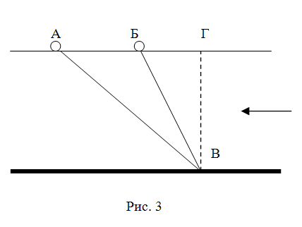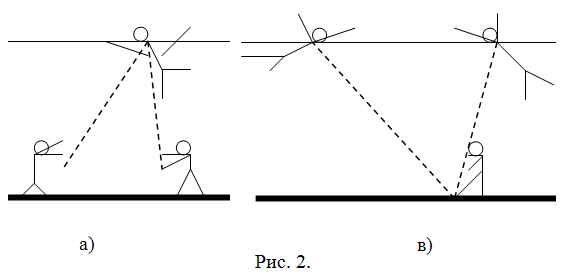 Сначала задачу решали, используя эмпатию. Один из слушателей, вживаясь в "образ ледокола", сосредоточенно ходил по комнате, а потом подошел к столу "Это - лед, - сказал слушатель - А я - ледокол. Я хочу пройти сквозь лед, но лед меня не пропускает..." Он давил на "лед", наскакивал на него с разбега, временами ноги "ледокола" пытались пройти под столом, но туловище этому мешало, иногда туловище пыталось пройти над столом, но мешали ноги... Отождествив себя с ледоколом, слушатель перенес на ледокол неделимость, присущую человеческому организму, и тем самым усложнил задачу, эмпатия в данном случае только затрудняла решение. На следующем занятии тот же слушатель решал задачу, используя метод ММЧ. Он подошел к столу, несколько секунд подумал, потом с некоторой растерянностью сказал: "Не понимаю, в чем задача... Если я состою из толпы маленьких человечков, верхняя половина толпы пройдет над столом, нижняя - под столом... По-видимому, задача теперь в том, как соединить две части ледокола - надводную и ту, что подо льдом. Придется ввести какие-то стойки, узкие, острые, они легко пройдут сквозь лед, не надо будет ломать огромную массу льда..." Метод ММЧ еще не исследован до конца, в нем много загадочного. Скажем, в задачах на измерение длины выделенную часть элемента лучше представлять не в виде сплошной шеренги человечков, а как шеренгу "через одного". Еще лучше, если человечки расположены в виде треугольника. И еще лучше - неправильным треугольником (с неравными или криволинейными сторонами). Почему? Пока тут можно только строить догадки. Но правило действует... Вспомним хотя бы задачу 7. Нужно измерить глубину реки с самолета. По условиям задачи вертолет применить нельзя, высадка людей недопустима, использовать какие-нибудь свойства радиоволн тоже нельзя, потому что нет возможности заказывать специальное оборудование. К тому же замеры глубины надо выполнить, в сущности, бесплатно (допустимы только расходы на оплату полета вдоль реки). Используем метод ММЧ. Еще неизвестная "измерялка", которую придется использовать, бросив или направив с самолета, должна иметь форму неправильного треугольника. Мыслимы только два варианта расположения маленьких человечков (рис. 2), образующих эту "измерялку". Верхние человечки должны быть легче воды, нижние - тяжелее. Предположим, что это деревяшки и камни, объединенные леской (рис. 3); реализовать такой треугольник нетрудно. Деревяшки А и Б соединены с камнем В лесками, причем длины обеих лесок заведомо превышают глубину реки (это можно проверить пробным сбросом). Чем глубже река, тем меньше расстояние АБ (деревяшки не связаны между собой). К одному из поплавков надо прикрепить (для "масштаба") метровую рейку, и можно сбрасывать это "оборудование", а затем фотографировать сверху. Зная АВ и БВ и измерив на снимке АБ, легко вычислить ВГ. Решение удивительно простое и красивое (а. с. № 180815). Прийти к нему без подсказки ("Сбрось трех человечков, прикажи им расположиться в виде неправильного треугольника...") очень трудно, читатель сможет убедиться в этом, предложив задачу своим коллегам...