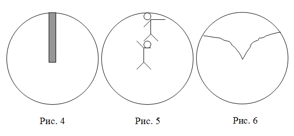 Рассмотрим теперь задачу 8, в ней речь идет об измерении радиуса шлифовального круга, поэтому здесь тоже должны помочь маленькие человечки. Шлифовальный круг обрабатывает деталь - со шлифованием, таким образом, все в порядке (в отличие от задачи 24), веполь уже есть. Но круг работает внутри цилиндра, и надо определить изменение радиуса круга, не выводя инструмент из недр детали. Задача класса 14. Решение (по таблице типовых моделей): к В2 надо присоединить такое В3, которое меняет поле П в зависимости от состояния В3 и, следовательно, В2. Если на торец круга нанести электропроводную полоску и пропускать ток, то по изменению сопротивления можно судить об изменения радиуса круга (рис. 4). К сожалению, такая схема не обеспечивает точность измерений. Сопротивление зависит не только от длины полоски, но и от силы прижатия круга к обрабатываемой поверхности и от состояния контакта "цепь-вал", и от температуры круга... Попробуем расположить маленьких человечков цепочкой "через одного" (рис. 5). Теперь об измерении радиуса круга можно судить по числу импульсов тока, а величина самих импульсов не имеет значения. Решение намного более эффективное, чем предыдущее. Правда, подвести ток к каждому человечку не так просто. Перейдем к "треугольнику". Правильный "треугольник" ничего не дает. Зато неправильный - это еще одно решение (рис. 6), причем теперь уже без изъянов: с изменением радиуса меняется скважность (отношение сигнала к паузе) проходящих импульсов, это позволяет просто и надежно измерять радиус круга.