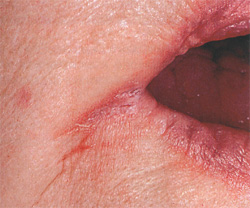 Заеда - заболевание возникает обычно в уголках рта, но нередки случаи его появления у крыльев носа и у наружного края глазной щели. Наиболее часто заеда встречается у ослабленных больных, при наличии таких хронических заболеваний, как ринит, конъюнктивит, кариозные зубы. Характеризуется заболевание появлением в уголках рта щелевидных трещин, состоящих из мелких и мягких пузырьков. Пузырьки лопаются, превращаясь в медово-желтые корочки, которые затем отпадают. Больные жалуются на болезненность при открывании рта, чувство жжения, зуд. Заболевание очень заразно. При пользовании общими предметами личной гигиены может поражать всю семью. ЛечениеИспользуют лекарственные препараты, обладающие дезинфицирующими и бактерицидными свойствами (настойки календулы, софоры японской, мяты, эвкалипта). Применяют мази с бессмертником, эвкалиптом, календулой и антибиотиками. A. Kapпeнкo Вся информация в разделе: Заболевания кожи |