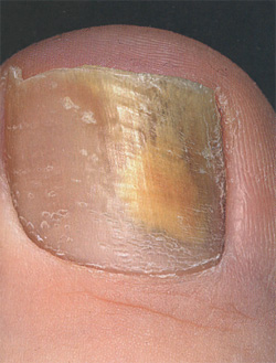 Онихомикозы - грибковые поражения ногтей наблюдаются у больных с эпидермофитией стоп, рубромикозом (на стопах и кистях), хронической трихофитией и фавусом (преимущественно на кистях), крайне редко - при микроспории. Онихомикоз начинается со свободного или латерального края ногтя. В его толще появляются округлые и полосовидные пятна желтоватого, реже серовато-белого цвета, которые постепенно сливаются друг с другом; развивается подногтевой гииеркератоз, ноготь утолщается, разрыхляется, становится ломким, крошится. Процесс разрушения, медленно распространяясь, может захватить весь ноготь. Вместе с тем при рубромикозе ногти пальцев рук могут остаться гладкими и блестящими, но подвергнуться истончению или отслойке от ложа; отслоившаяся часть приобретает грязно-серый цвет. Онихомикоз может быть изолированным, то есть без поражения кожи и волос. При микроскопическом исследовании кусочков пораженных ногтей определяются преимущественно нити мицелия. Лечение онихомикозаЛечение онихомикоза - сложный и трудоемкий процесс. Его эффективность зависит в основном от тщательности проведения назначенных манипуляций. Лечение предусматривает применение противогрибковых средств общего действия, удаление ногтевых пластинок и местную фунгицидную терапию. К наиболее эффективным антимикотическим препаратам общего действия относятся ламизил, орунгал и низорал. Ламизил применяют по 0,125 г 2 раза вдень или по 0,25 г 1 раз в день после еды в течение 6 нед - 4 мес в зависимости от тяжести поражения. Применение ламизи-ла позволяет проводить лечение онихомикозов без удаления ногтевых пластинок. Низорал используют по 0,2 г 1 раз в день в течение 6-10 нед. Гризеофульвин применяют по 0,25 г 3 раза в день в течение 1 мес, затем в той же дозе через день в течение второго месяца, а в последующем в той же дозе один раз в неделю до полного отрастания ногтевых пластинок после их предварительного удаления. При приеме препарат следует запивать столовой ложкой растительного масла. Удаление ногтей производят хирургическим путем или при помощи кератолитических пластырей. Операция и первое наложение пластыря должны совпадать с началом приема противогрибковых средств общего действия. Хирургический метод удаления ногтейДля обезболивания применяют 1% раствор новокаина. На палец накладывают жгут, раствор новокаина вводят подкожно в латеральную поверхность дистальной фаланги в количестве 3-5 мл. Браншей ножниц или распатором отслаивают ногтевую кожицу от ногтя и ноготь от его ложа. Затем ноготь удаляют зажимом Пеана и тщательно очищают ложе от гиперкератотических масс маникюрными щипцами. Ложе ногтя обрабатывают 5% спиртовым раствором йода, накладывают повязку с мазью Вишневского или 5% синтомициновой эмульсией на 5-6 дней, в последующие 3-4 дня повязку меняют ежедневно. После эпителизации ложа ногтя (через 10-12 дней) назначают наружные фунгицидные средства. Удаление ногтей кератолитическими пластырямиПрименяют 20% мочевинный (уреапласт) или 10% трихлоруксусный пластырь. Для изготовления пластырей 20 г мочевины (можно использовать техническую мочевину) или 10 г трихлоруксусной кислоты растворяют соответственно в 10 или 15 мл горячей воды. Полученный раствор вливают при непрерывном помешивании в предварительно расплавленную в фарфоровой чашке на водяной бане пластырную 