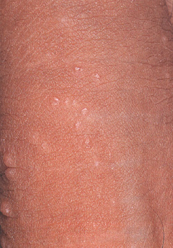 Заболевание вызывается вирусом контагиозного моллюска, относящимся к Poxuris,который размножается в цитоплазме инфицированных эпидермоцитов, вследствие чего развивается инфекционный акантоз. Заражение контагиозным моллюскомЗаболевание вирусом контагиозного моллюска может появиться в любом возрасте, но чаще болеют дети, преимущественно мальчики. Пути передачи вируса контагиозного моллюска точно не установлены; наблюдались вспышки среди детей, посещавших бассейны. У взрослых людей заражение вирусом контагиозного моллюска часто происходит половым путем; при иммуносупрессии может происходить выраженная диссеминация контагиозного моллюска по всему телу. Симптомы контагиозного моллюскаМорфологическим элементом кожной сыпи является мелкая папула диаметром 3-6 мм, изредка размеры папул достигают 3 см. Папулы имеют гладкую, блестящую поверхность телесного с перламутровым оттенком цвета, часто с пупковидным вдавлением в центре. В области пупковидного вдавления отмечается творожистоподобный стержень, который легко выдавливается. Нередко папулы располагаются на эритематозном фоне. Высыпания контагиозного моллюска могут располагаться на любом участке кожи и слизистых оболочек. Они не склонны к слиянию, могут быть диссеминированными или группироваться в одной области тела. В большинстве случаев количество папул не превышает 10-20, но иногда достигает нескольких сотен. Заболевание вирусом контагиозного моллюска обычно протекает асимптомно, иногда возникает зуд; вокруг некоторых папул может появиться экзематизация. Контагиозный моллюск, локализующийся на бровях, может приводить к развитию конъюнктивита или кератита. А. Н. Poдиoнoв Вся информация в разделе: Заболевания кожи |