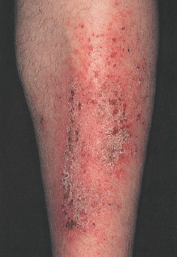 Лечение больных экземой должно начинаться с тщательного обследования больного для выявления и ликвидации тех патологических очагов, которые могли вызвать изменения реактивности кожи (неврозы, болезни внутренних органов, хронические очаги инфекции, в том числе хронические стрептодермии, послераневые рубцы и т. д.). Далее необходимо исключить раздражающее влияние различных факторов как на нервную систему больного, так и на его кожу. Назначают седативные, десенсибилизирующие и противовоспалительные средства: препараты кальция (10% раствор кальция хлорида и кальция глюконата внутривенно или 10% раствор кальция глюконата внутримышечно, по 10 мл через день, всего 8-10 инъекций), антигистаминные препараты, витамины В,, С и Р. Наружное лечение должно соответствовать стадии воспалительного процесса. На мокнущие очаги накладывают влажновысыхающие повязки из 3% раствора борной кислоты или 0,25% нитрата серебра. По прекращении мокнутия применяют пасты, содержащие ихтиол или нафталан (3-5%). При всех формах экземы, особенно при дисгидротической, хороший терапевтический эффект в острой и подострой стадии отмечен от применения мази Ультралан. Очаги хронической экземы разрешают 3-10% дегтярными пастами, а затем аналогичными мазями. А. Н. Poдиoнoв Вся информация в разделе: Заболевания кожи |