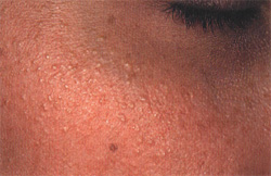 Синонимы: роговые кисты, белый угорь, acne albida, grutum. Милиумы - это ретенционные кисты, образующиеся вследствие закупорки волосяного фолликула и сальных желез роговыми массами. Образование милиумов может быть связано с межфолликулярным эпидермисом, а также с ороговевающими участками устья волосяного фолликула или выводного протока эккринной потовой железы. Различают первичные милиумы, рассматриваемые иногда как пороки развития и возникающие спонтанно (могут быть спровоцированы ультрафиолетовыми лучами), и вторичные (псевдомилиум Бальзера), которые образуются после травматических и воспалительных повреждений в рубцах, особенно часто - при буллезном эпидермолизе, поздней кожной порфирии. Стенка кисты представлена эпидермисом, в котором сохранены все слои, содержимое - плотные слоистые роговые массы с примесью жира. Клинически милиумы представляют собой множественные, располагающиеся группами (но почти никогда не сливающиеся) плотные саговидные узелки молочно-белого или желтоватого цвета, размером 0,5-3 мм, как бы вкрапленные в кожу. Локализуются они преимущественно на лице, в основном на веках и вокруг глаз, но могут обнаруживаться и на гениталиях, и на туловище. Иногда милиумы находят уже у новорожденных, но чаще они возникают в период полового созревания на фоне акне или несколько позже. Женщины болеют несколько чаще. Течение благоприятное, элементы могут существовать годами без изменений, но иногда спонтанно вскрываются и могут подвергаться инволюции. После воспаления и нагноения возможно образование атрофического рубчика. Диагноз несложен благодаря характерным внешним признакам. Дифференциальная диагностика. Первичные, или истинные, милиумы следует дифференцировать от вторичных псевдомилиумов, микроретенционных кист сальных желез у больных себореей, сирингом. Лечение. Электрокоагуляция, лазерная коагуляция, кюретаж, механическое вскрытие с последующей энуклеацией рогового ядрышка инъекционной иглой, выдавливание и пр. Целесообразна постманипуляционная обработка кожи растворами антисептиков, профилактическая обработка зон поражения 1%-м раствором салицилового спирта. Во избежание рецидива рекомендуется использование электролиза для разрушения оставшейся кистозной стенки. Ред. C. Дaнилoв Вся информация в разделе: Заболевания кожи |