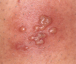 Герпес простой вызывается вирусами простого герпеса 1 и 2 типов (ВПГ-1 и ВПГ-2). Заражение герпесомВирус простого герпеса -1 попадает в организм через дыхательные пути, вирус простого герпеса -2 - при половых контактах. Персистирует вирус простого герпеса -1 в клетках тройничного ганглия, а вирус простого герпеса -2 в клетках сакрального ганглия. Клиника герпесаВысыпания при вирусе простого герпеса -1 чаще всего локализуются на крыльях носа, углах рта, красной кайме губ, при вирусе простого герпеса -2 - на половых органах, но может быть наоборот. На фоне ограниченной гиперемии появляются пузырьки, содержащие прозрачный экссудат. Пузырьки обычно располагаются группами, их появление сопровождается чувством покалывания, жжения, боли. Общее состояние обычно не изменяется, но иногда может повышаться температура. Содержимое пузырьков может ссыхаться в корку (если они расположены на местах, не подвергающихся трению и мацерации), которая затем отпадает, в противном случае пузырьки вскрываются, образуя эрозию. Заболевание длится в среднем 1-1,5 недели. Дифференциальная диагностика герпесаДифференциальная диагностика герпеса проводится с твердым шанкром, с много-формной экссудативной эритемой, с обыкновенной пузырчаткой. ЛечениеНаружно спиртовые растворы анилиновых красителей, мази, содержащие противовирусные вещества, лейкоцитарный интерферон; для предотвращения рецидивов - иммуностимуляторы, герпетическая поливалентная вакцина, противовирусные препараты. Koзopeз E.C. Вся информация в разделе: Заболевания кожи |