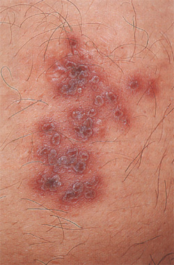 Опоясывающий лишай (герпес зостер) - пузырьковый лишай вызывается Strongiloplasma zonae. Возбудители ветряной оспы и опоясывающим лишаем идентичны. Клиника опоясывающего лишаяНа гиперемированном фоне соответственно ходу нервов появляются пузырьки с прозрачным содержимым. Для высыпаний при опоясывающем лишае характерно симметричное одностороннее расположение. Высыпаниям предшествуют приступообразные боли, иррадиирующие по ходу нервных стволов, жжение, общая слабость, лихорадка, головная боль. Клинические разновидности опоясывающего лишая: генерализованный опоясывающий лишай, геморрагический лишай, абортивная форма, буллезная форма. Дифференциальная диагностикаДифференциальная диагностика с простым пузырьковым лишаем, с рожистым воспалением. ЛечениеЛечение: анальгетики для снятия болей, инъекции ДНК, противовирусные препараты, антибиотики при присоединении вторичной инфекции. Koзopeз E.C. Вся информация в разделе: Заболевания кожи |