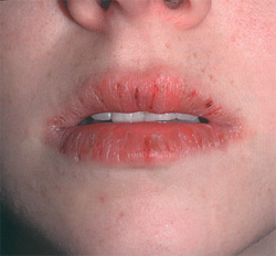 Дисгидротическая экзема. Высыпания располагаются на ладонях, подошвах и боковых поверхностях пальцев. Клинически характеризуется появлением пузырьков. Вследствие толстого рогового слоя пузырьки сливаются между собой и образуют полости и крупные пузыри. После вскрытия обнажается мокнущая поверхность, по периферии которой имеется бордюр подрытого рогового слоя. Экзема губ, или экзематозный хейлит. Проявляется высыпаниями на красной кайме губ. Процесс не сопровождается значительным воспалением; мокнутие минимально, в хронической стадии лихенификация незначительна. Превалирует картина подострого воспаления с образованием маленьких тонких корочек и чешуек, могут возникать многочисленные трещины, покрывающиеся кровянистыми корочками. Koзopeз E.C. Вся информация в разделе: Заболевания кожи |