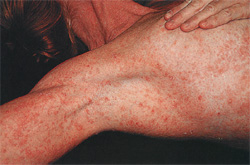 Розовый лишай - заболевание кожи из группы инфекционных эритем. Возбудитель розового лишая неизвестен (предполагается вирус). Развитию розового лишая способствует простуда. Вспышки розового лишая отмечаются чаще весной и осенью. Характерны цикличность и безрецидивность, видимо, обусловленные развитием иммунитета. Клиническая картина розового лишаяБолезнь начинается (обычно на фоне или вскоре после простудного заболевания) с появления на коже туловища единичного крупного округлого пятна розового цвета диаметром 2 см и более (материнская бляшка), центральная часть которого постепенно приобретает желтоватый оттенок, как бы сморщивается и начинает слегка шелушиться. Через несколько дней после появления материнской бляшки на коже туловища и конечностей возникают множественные мелкие овальные розовые пятна диаметром 0,5-1 см, расположенные по линиям Лангера. Постепенно в центре пятен выявляются едва заметные сухие складчатые чешуйки, а по периферии - свободная от чешуек красная кайма, отчего пятна приобретают сходство с медальонами. Сыпь не склонна к слиянию. Субъективные ощущения чаще отсутствуют, однако возможен зуд. Продолжительность заболевания - 4-6 недель, после чего высыпания самопроизвольно исчезают. При нерациональной раздражающей терапии, частом мытье, а также при повышенной потливости и у лиц с аллергическими реакциями высыпания могут зкзематизироваться и сохраняться значительно больший период времени. Диагноз розового лишаяДиагноз розового лишая основывается на характерной клинической картине. Дифференциальная диагностика: сифилитическую розеолу исключают на основании наличия шелушения, материнской бляшки, отрицательных серологических реакций и отсутствия других признаков сифилиса. Лечение розового лишая Запрещают мытье и ношение шерстяного и синтетического белья. Назначают препараты кальция, антигистаминные препараты, аскорутин. В случае распространенных форм заболевания с выраженной температурной реакцией дополнительно могут быть назначены антибиотики широкого спектра действия (олететрин по 0,25 г 4 раза в день). Наружно: припудривание водной взбалтываемой взвесью (окись цинка, крахмал, тальк по 10 г, глицерин - 20 мл, вода дистиллированная - 100 мл), кортикостероидные мази. Koзopeз E.C. Вся информация в разделе: Заболевания кожи |