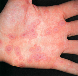 Патогенез многоформной экссудативной эритемыОсновной механизм патогенеза - III тип аллергической реакции - реакция Артюса. С позиции аллергологии многоформная экссудативная эритема - смешанная реакция с чертами гиперчувствительности немедленного и замедленного типа. Основные элементы поражения - субэпительный пузырь (в результате тромбоза капилляров подслизистого слоя, некроза, экссудации), а также многоформная эритема - энантема. Фон многоформной экссудативной эритемы - атопия, выражающаяся в повышении общего IgE; персистенция хронической инфекции в организме; снижение IgA, являющегося одним из представителей "первой линии обороны" кожи и в большей степени слизистых оболочек. Толчком к рецидиву многоформной экссудативной эритемы часто служит стресс или переутомление. Клиника многоформной экссудативной эритемыОстрое начало с нарушением общего состояния, повышением температуры тела до 38-40°С, ревматоидными болями. Через 1-2 дня - высыпания на коже кистей рук, предплечья, голени, реже шее, лица в виде "кокард". На фоне гиперемии - болезненные элементы поражения в виде волдырей или пузырей с серозным или геморрагическим содержимым, которые быстро лопаются и образуют эрозии, часто сливающиеся, покрытые желтоватым налетом. Название "многоформная" оправдано тем, что у пациентов в том или ином количестве могут присутствовать пятна, пустулы, пузыри, реже встречаются элементы по типу "пальпируемой пурпуры". В случае мономорфной пузырной сыпи, при отсутствии или малом количестве типичных "мишеней", диагноз МЭЭ может вызывать затруднения. При разнообразии "палитры" цвета элементов у разных больных почти всегда наблюдается розовый или фиолетовый оттенок, вероятно, связанный с преобладанием лимфоцитов. Симптом Никольского отрицательный. Региональные лимфатические узлы болезненные, увеличенные. Разрешение высыпаний происходит через 2-3 недели. Локализация многоформной экссудативной эритемы: лицо, слизистые, разгибательная поверхность конечностей, тыльные стороны кистей и стоп, ладони, подошвы, туловище, редко волосистая часть головы. Расположение сыпи всегда симметричное. Течение многоформной экссудативной эритемы острое, наблюдается склонность к рецидивированию с той или иной частотой. Редко рецидивирующие формы проходят без лечения или после минимальных лечебных мероприятий. Токсико-аллергическая форма многоформной экссудативной эритемы характеризуется более яркой гиперемией, тенденцией к слиянию очагов, частым поражением слизистых, в том числе гениталий, более выраженным эпидермолитическим компонентом (пузыри), изоморфной реакцией. Инфекционно-аллергическая форма многоформной экссудативной эритемы чаще проявляется небольшими элементами, более "застойного" оттенка, не имеющими тенденции к слиянию, тяготеющими к локализации на конечностях и реже поражающими слизистые. Эта форма встречается чаще и создает больше терапевтических затруднений. Известно много бактериальных и вирусных агентов, которые провоцируют развитие многоформной экссудативной эритемы. Как правило, это возбудители, которые формируют в организме очаг хронической персистенции с периодическими обострениями, что способствует сенсибилизации к инфекту. Тяжелой клинической формой экссудативной эритемы является синдром Стивенса-Джонсона - наряду