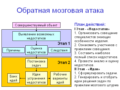 Одной из разновидностей "мозгового штурма" является "Обратная мозговая атака". Здесь процесс поиска технических решений или бизнес идей разделен на три этапа. На первом этапе выявляются все возможные недостатки совершенствуемого объекта. На основании этих недостатков формулируются задачи. Вторым и третьем этапом являются этапы обычного "мозгового штурма". Таким образом, отражая более полно недостатки объекта, удается находить большее число изобретательских решений и бизнес идей по его совершенствованию.